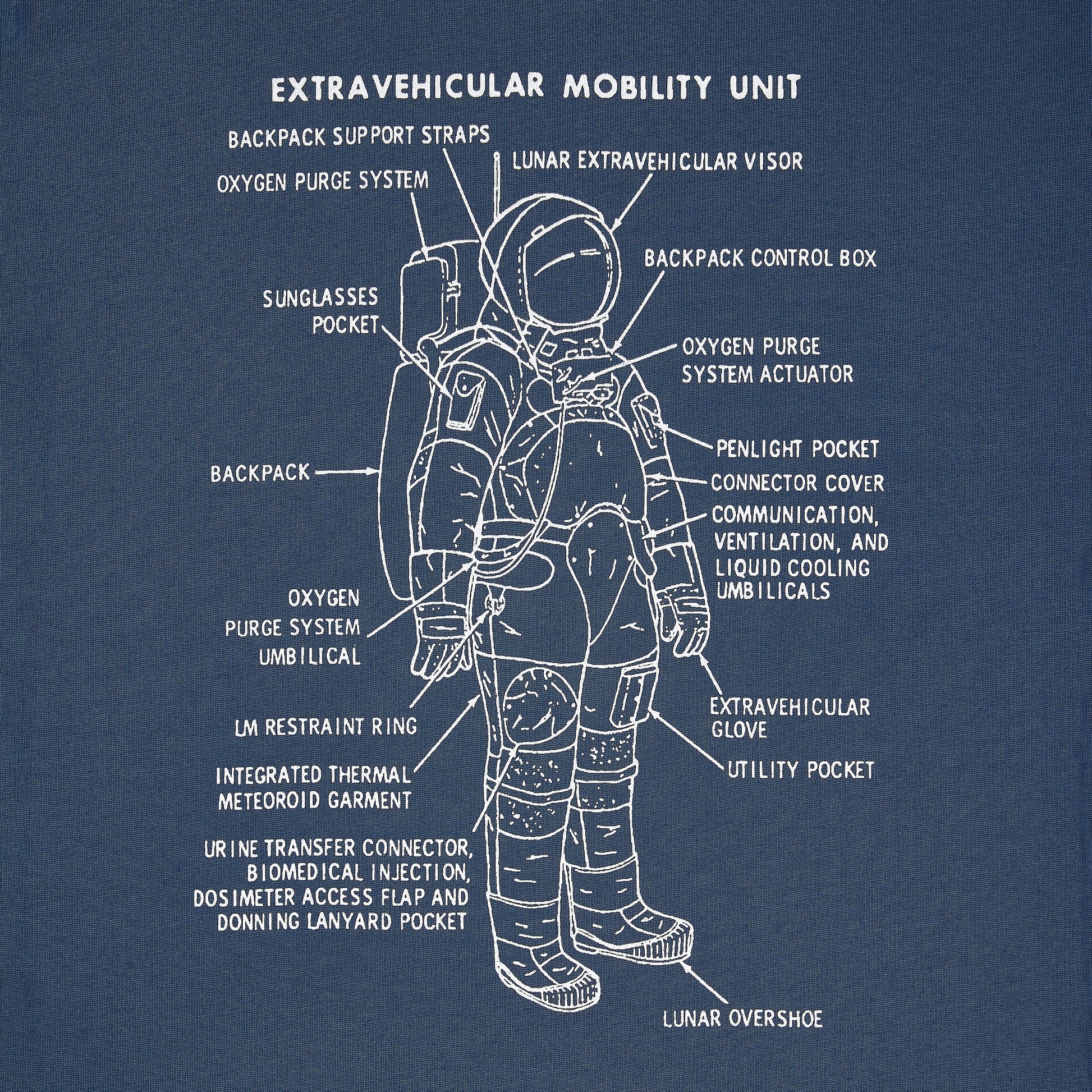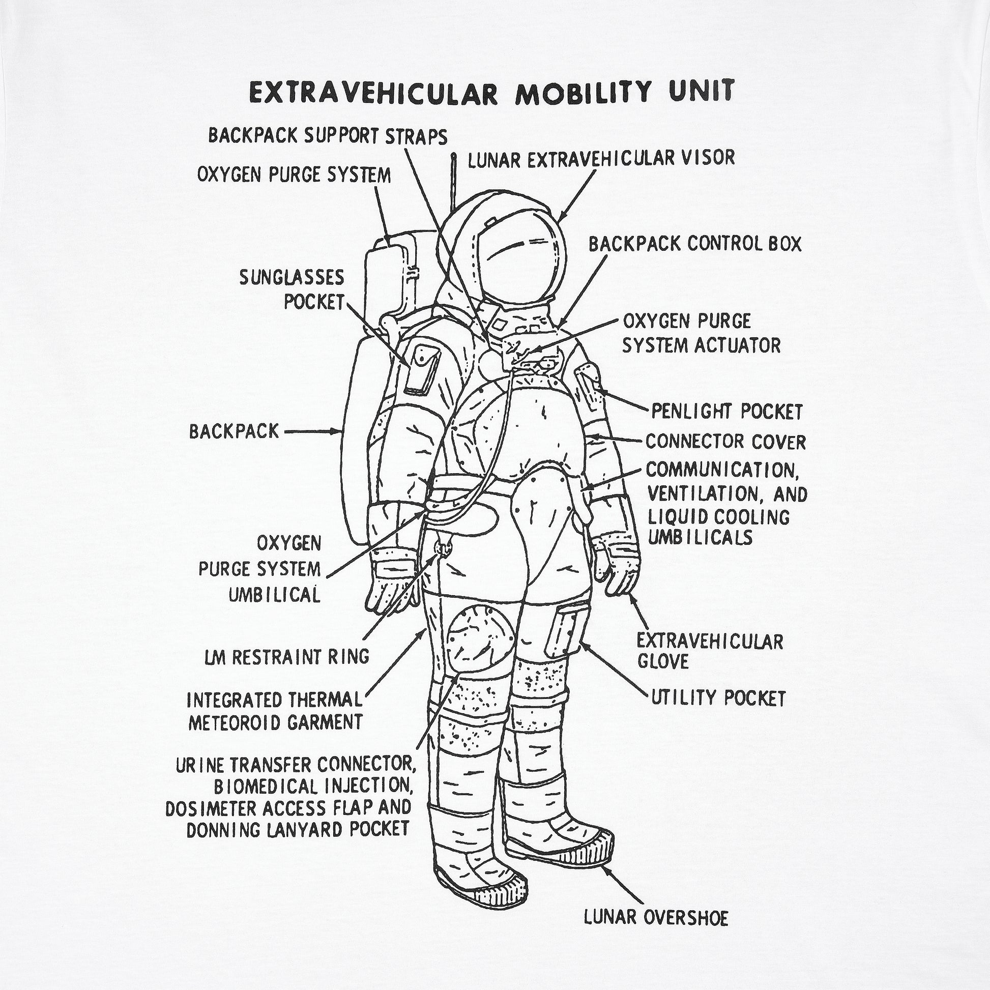 Made from 100% cotton, featuring an annotated archival diagram, and available in spacesuit white for adults or insignia blue for kids.