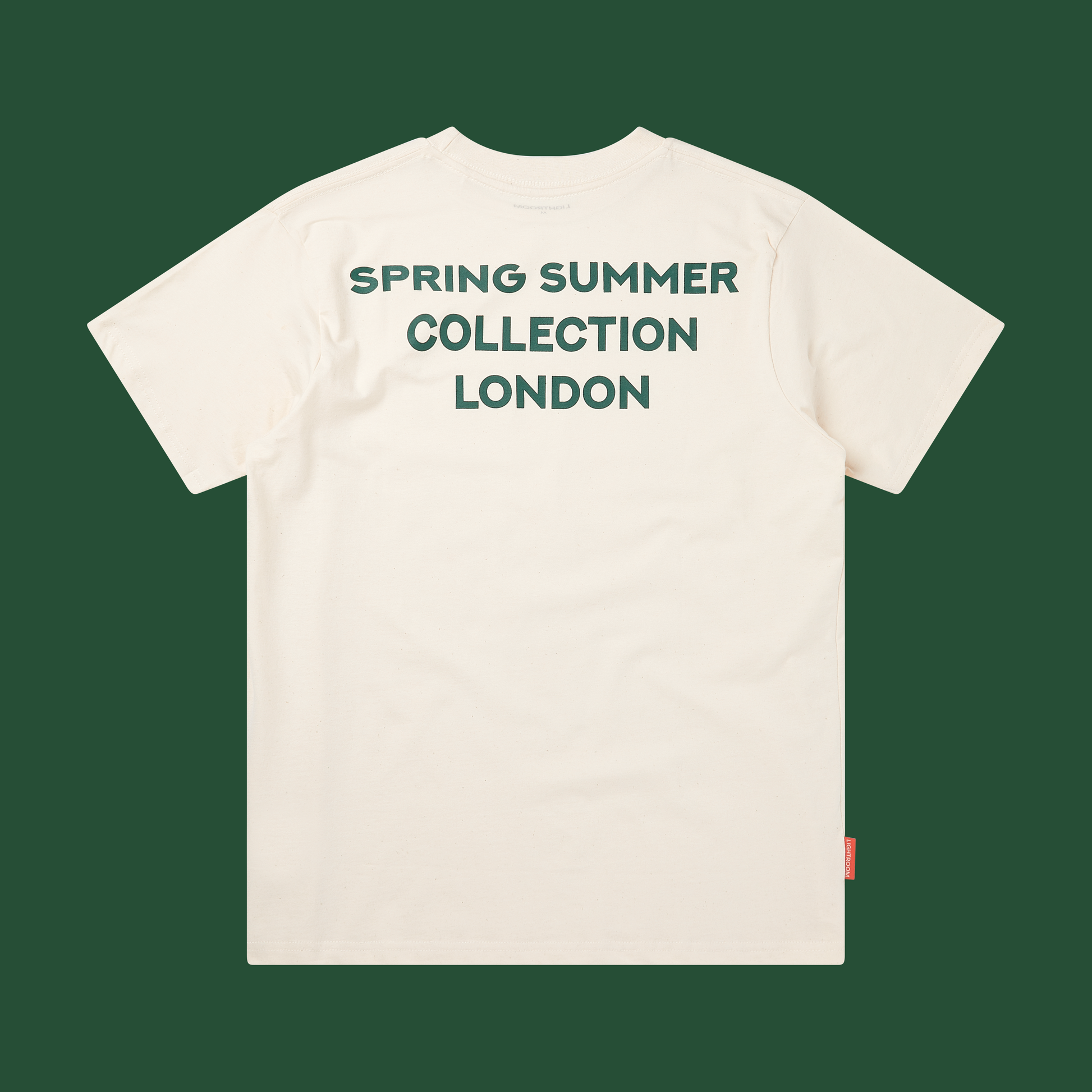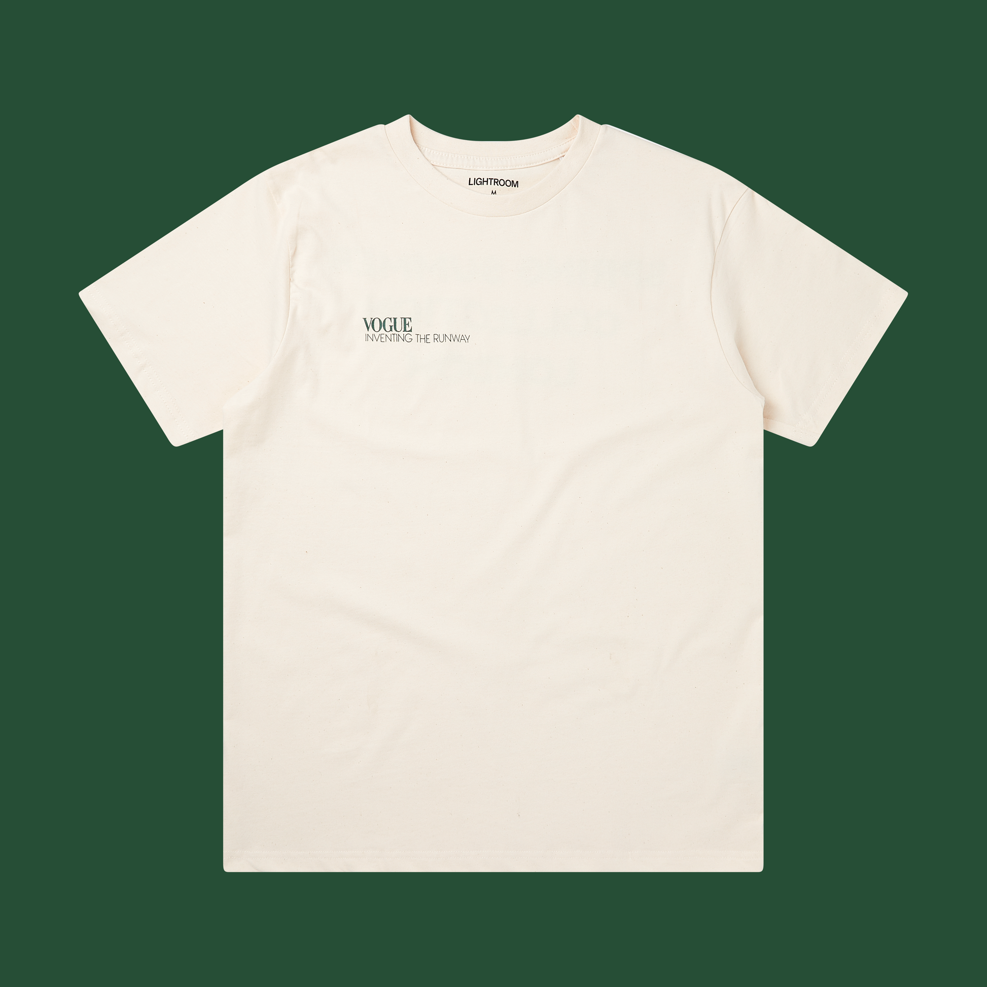 From our Spring Summer Collection, this loose fit tee is crafted in 100% unbleached organic cotton. It features the Vogue: Inventing the Runway printed in Eden Green on the right breast and “Spring Summer Collection London” across the back.